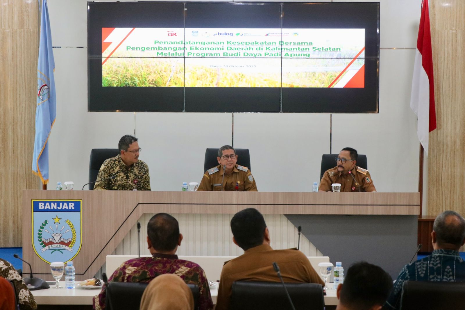 MARTAPURA, InfoPublik – Sejumlah pihak menandatangani komitmen bersama untuk mendukung pengembangan ekonomi daerah melalui program budidaya padi apung di Kabupaten Banjar. Penandatanganan berlangsung di Aula Barakat, Kantor Bupati Banjar, Martapura, Selasa (14/10/2025) pagi.