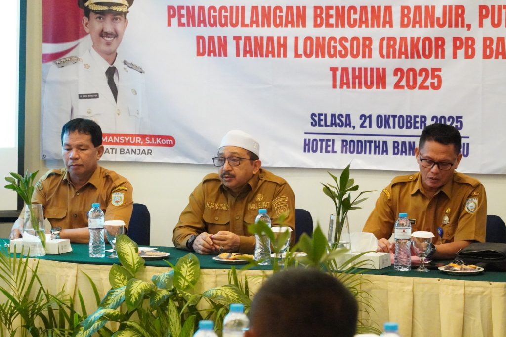 BANJARBARU, InfoPublik – Badan Penanggulangan Bencana Daerah (BPBD) Kabupaten Banjar menggelar Rapat Koordinasi Penanggulangan Bencana Banjir, Puting Beliung, dan Tanah Longsor (PB Batingsor) Tahun Anggaran 2025, bertempat di Hotel Roditha Banjarbaru, Selasa (21/10/2025) pagi.