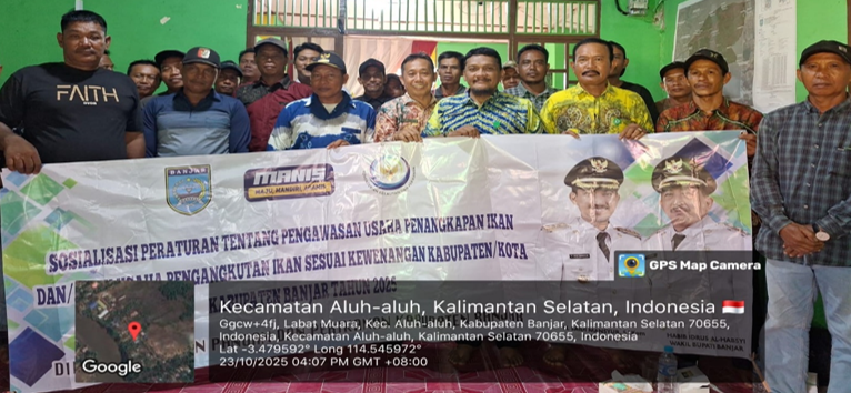 BANJAR, Infopublik - Pemerintah Kabupaten Banjar melalui Dinas Ketahanan Pangan dan Perikanan (DKPP) pada Bidang Pengembangan dan Pengawasan Usaha Perikanan Seksi Pengawasan Sumberdaya Perikanan menggelar sosialisasi Peraturan Tentang Pengawasan Usaha Penangkapan Ikan Dan/Atau Usaha Pengangkutan Ikan di Desa Pemurus Kecamatan Aluh-Aluh Kabupaten Banjar, Selasa (23/10/2025).