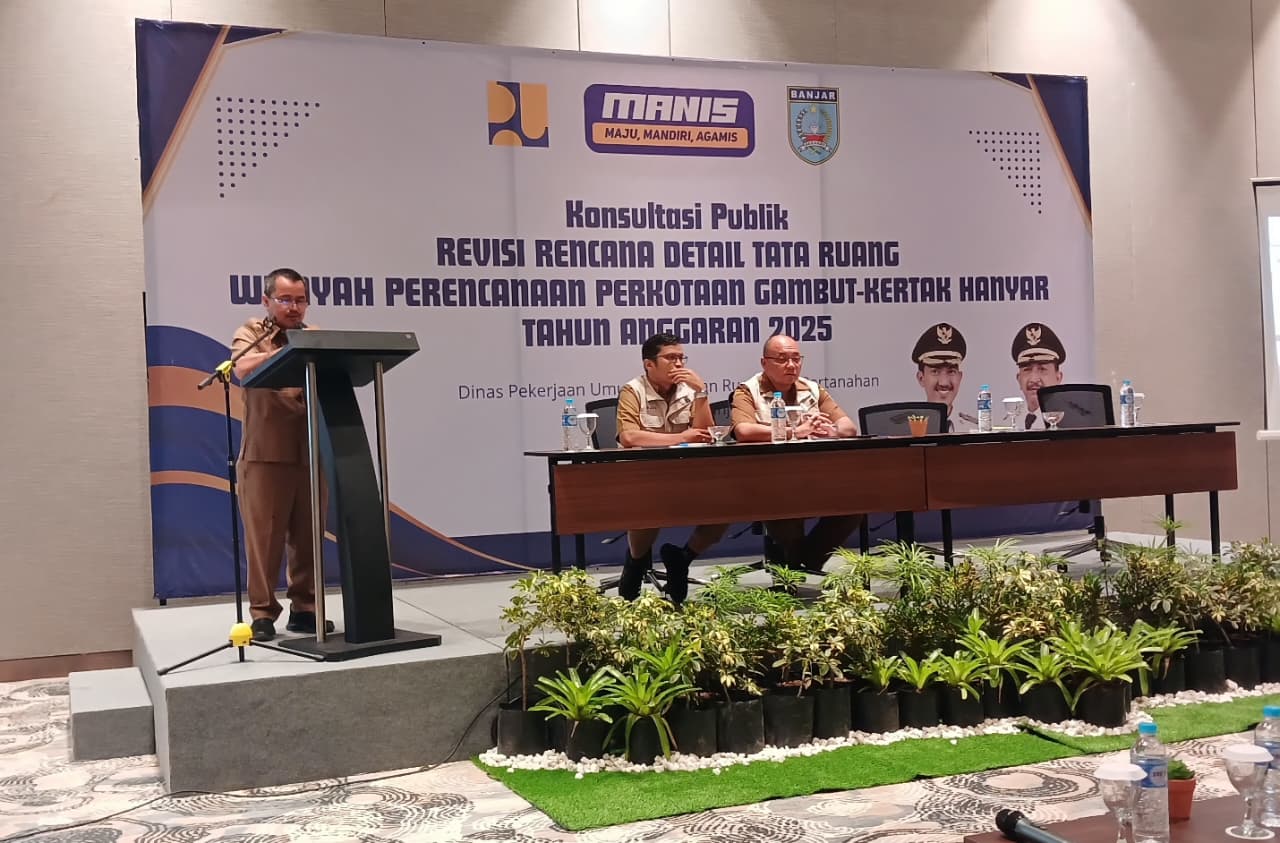 MARTAPURA, InfoPublik - Dinas Pekerjaan Umum Penataan Ruang dan Pertanahan (PUPRP) Kabupaten Banjar menggelar rapat Konsultasi Publik I tentang revisi Rencana Detail Tata Ruang (RDTR) wilayah perkotaan Gambut dan Kertak Hanyar Kabupaten Banjar, Senin (27/10/2025) di Gambut