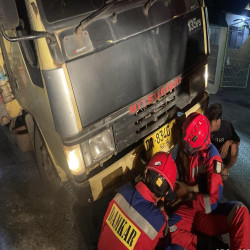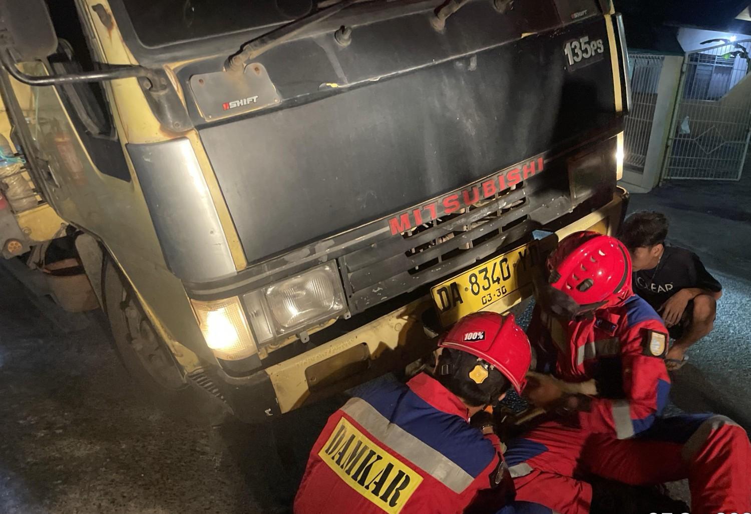 Petugas Damkar Banjar membantu mengevakuasi truk tersebut menggunakan fire truk.