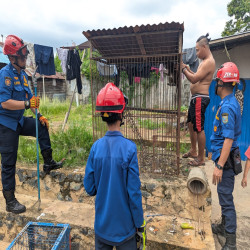 Petugas Dinas Pemadam Kebakaran dan Penyelamatan (DPKP) Kabupaten Banjar mengevakuasi satu ekor monyet di Jalan Sultan Adam Gang Al Habsyi RT 2 RW 1 Kelurahan Tanjung Rema Kecamatan Martapura Kota, Kamis (6/11/2025) siang.