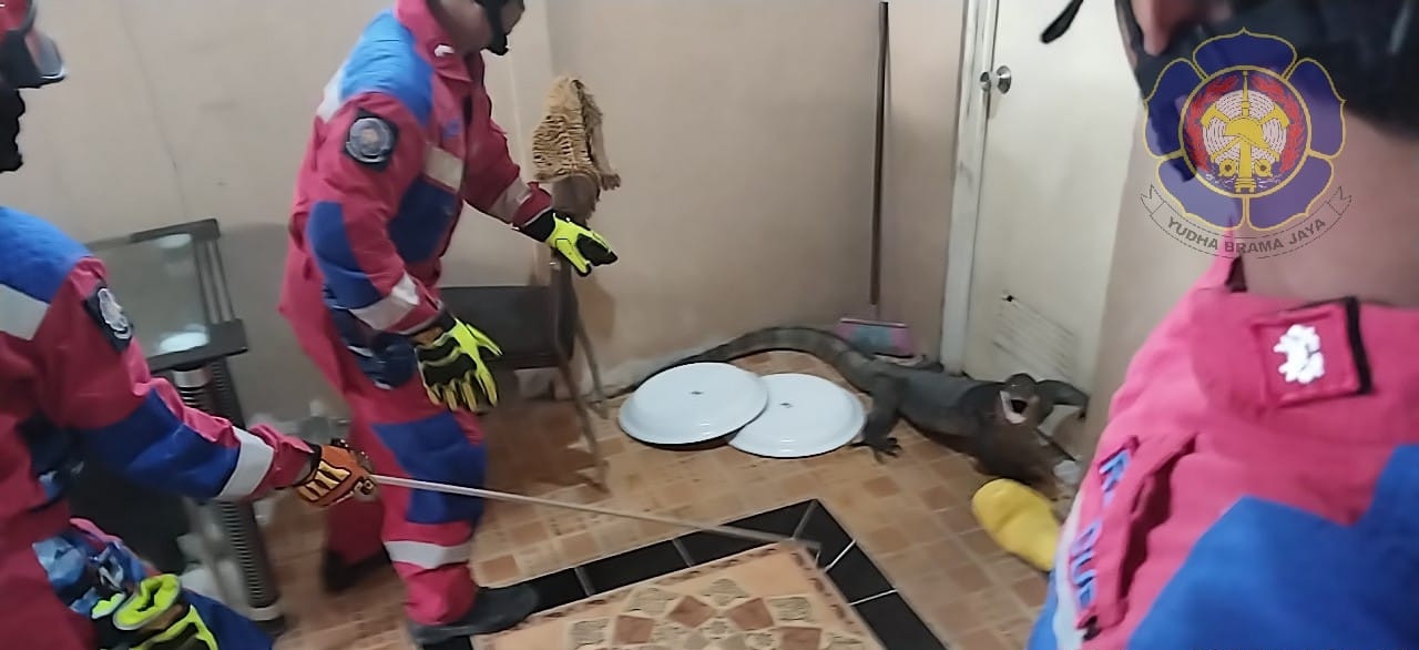 Tak berselang lama, sekitar pukul 14:38 Wita petugas berhasil mengevakuasi biawak tersebut, kemudian memastikan lokasi benar-benar aman.