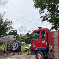 Petugas Damkar Banjar bersama masyarakat sekitar membantu mengevakuasi mobil tersebut menggunakan unit fire truk dan tali.