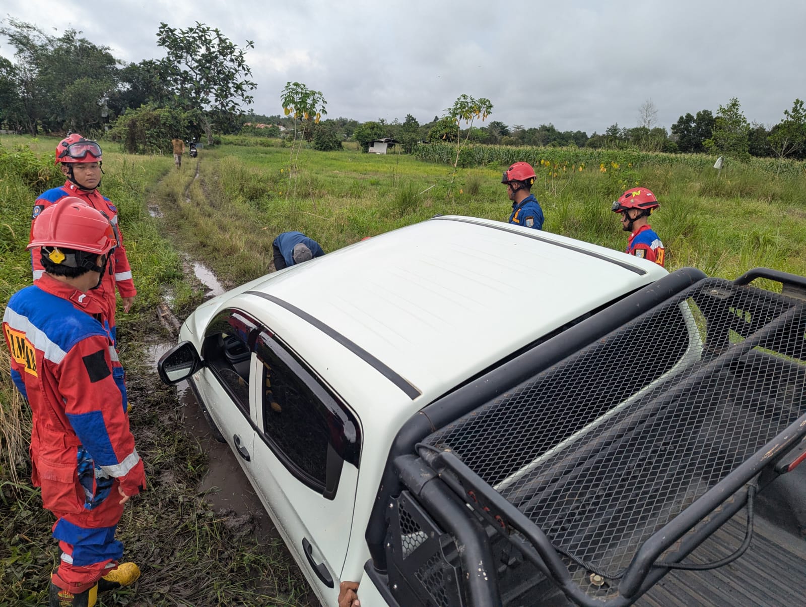 "Setelah menceoba sendiri untuk mengeluarkan mobil dan tidak bisa juga, akhirnya menelpon Petugas Damkar. Didalam mobil ada 3 orang. Selang petugas damkar datang ± 20 menit kemudian mobil bisa diselamatkan dengan di tarik menggunakan winch," terangnya.