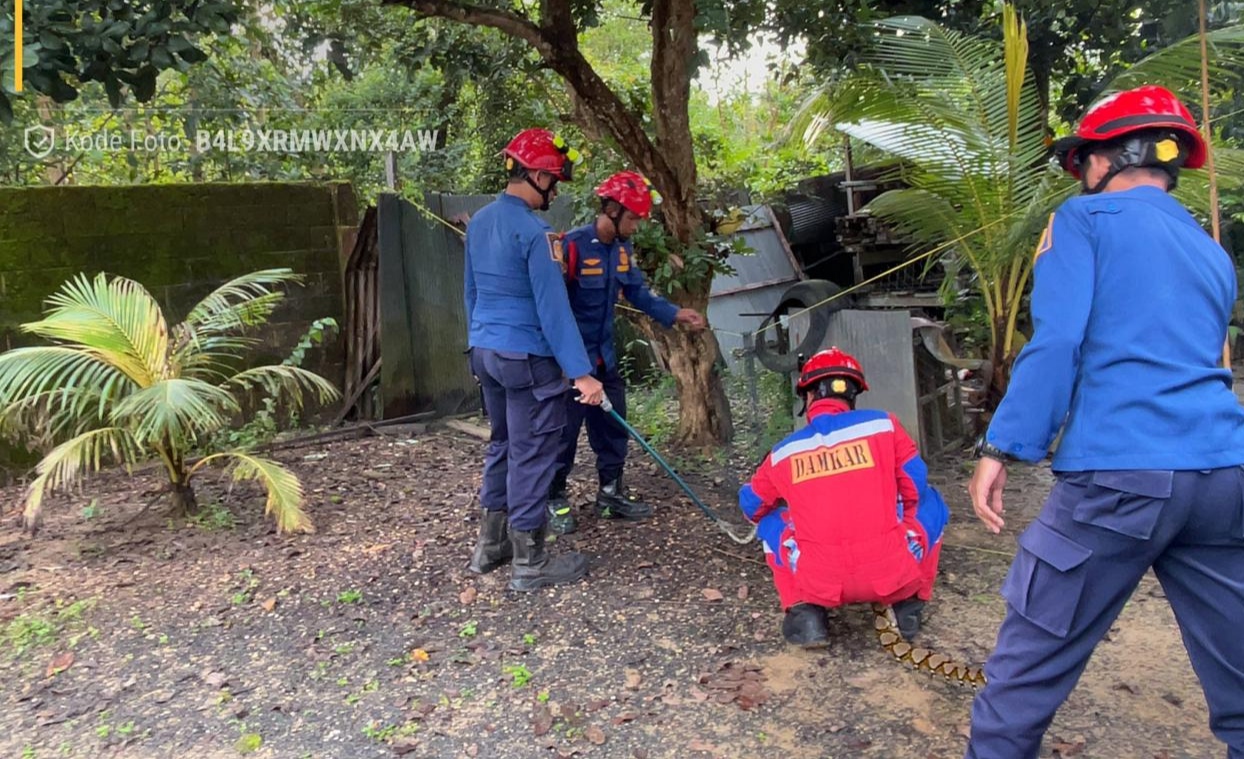MARTAPURA, InfoPublik - Petugas Dinas Pemadam Kebakaran dan Penyelamatan (DPKP) Kabupaten Banjar Sektor Gambut berhasil menangkap ular phyton/sanca batik berukuran ± 3 meter, di Jalan Irigasi Gang Mutiara Indah RT 7 RW 3 Kelurahan Bincau, Rabu (7/1/2026) pukul 7:26 wita.
