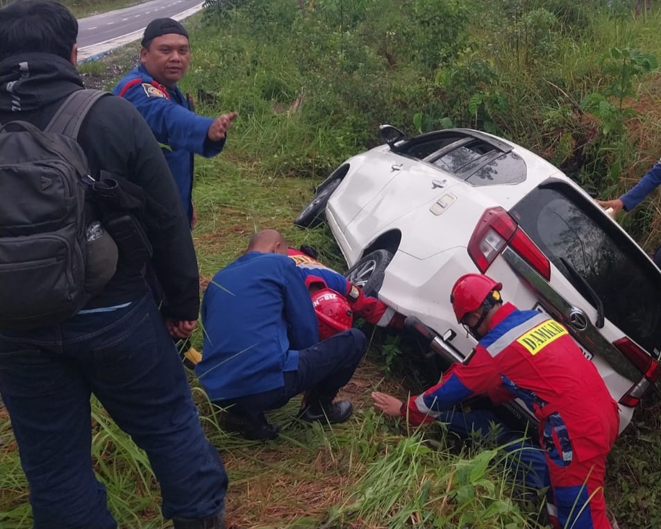 Damkar Banjar Bantu Evakuasi Mobil Keluar Jalur