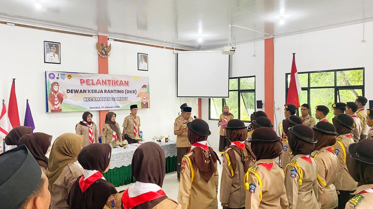 GAMBUT, InfoPublik – Camat Gambut Ahmad Fauzan selaku Ketua Mabiran melantik Dewan Kerja Ranting (DKR) gerakan Pramuka Kecamatan Gambut, di Aula Kecamatan Gambut, Sabtu (24/1/2026). Terpilih dan dilantik sebagai Ketua Kwartir Ranting (Kwaran) Gerakan Pramuka Gambut Wahyuni.