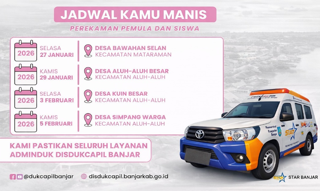 Dinas Kependudukan dan Pencatatan Sipil (Disdukcapil) Kabupaten Banjar melaksanakan kegiatan KAMU MANIS (Perekaman Pemula dan Siswa) di wilayah Kecamatan Mataraman dan Kecamatan Aluh-Aluh, Selasa (27/1/2026).