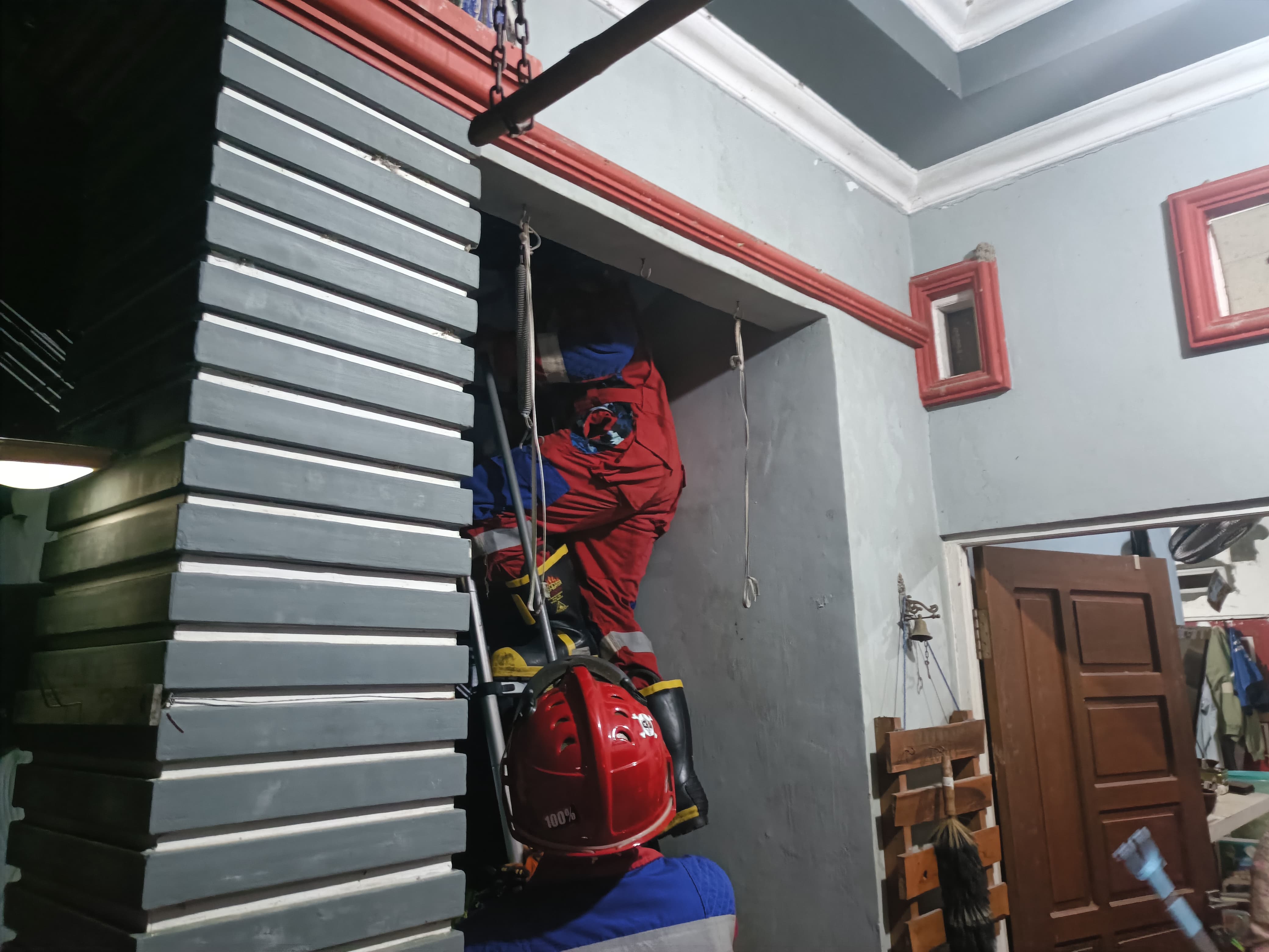 Personel damkar diterjunkan untuk evakuasi musang tersebut. Butuh waktu sekitar ± 25 menit bagi petugas untuk evakuasi.