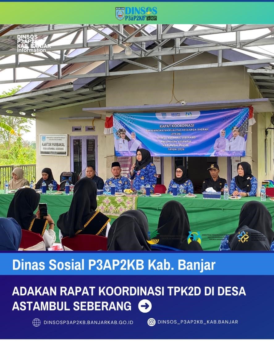 MARTAPURA, InfoPublik – Dinas Sosial Pemberdayaan Perempuan, Perlindungan Anak, Pengendalian Penduduk dan Keluarga Berencana (Dinsos P3AP2KB) Kabupaten Banjar menggelar Rapat Koordinasi Tim Peningkatan Kualitas Keluarga Daerah (TPK2D) sebagai upaya memperkuat sinergi lintas sektor dalam meningkatkan ketahanan dan kualitas keluarga di Kabupaten Banjar khususnya Desa Astambul Seberang. Kegiatan dilaksanakan di Desa Astambul Seberang, Kecamatan Astambul, pada Rabu (18/02/2026). Rakor dibuka secara resmi oleh Kepala Dinsos P3AP2KB Kabupaten Banjar, ibu Dr. Hj. Erny Wahdini, S.Pd., M.Pd dengan peserta yang hadir terdiri dari perwakilan OPD, lembaga terkait, serta aparat Desa Astambul Seberang. Desa Astambul Seberang dipilih sebagai desa lokus untuk penilaian Lomba TPK2D Tahun 2026. Oleh karena itu, rapat koordinasi ini menjadi langkah awal dalam mempersiapkan desa tersebut melalui penguatan program dan kolaborasi lintas sektor. Rakor menghadirkan narasumber dari DPPPKB Provinsi Kalimantan Selatan yang memaparkan arah kebijakan dan indikator penilaian TPK2D, serta Kepala Bidang PPPA Dinsos P3AP2KB Kabupaten Banjar yang menyampaikan strategi implementasi di tingkat kabupaten dan desa. Melalui kegiatan ini diharapkan terbangun komitmen bersama serta langkah nyata dalam meningkatkan kualitas keluarga di Desa Astambul Seberang, sekaligus mendorong terwujudnya keluarga yang harmonis, berdaya, dan sejahtera di Kabupaten Banjar. Penulis & Editor Rima Nazila : Dinsos P3AP2KB Kab. Banjar