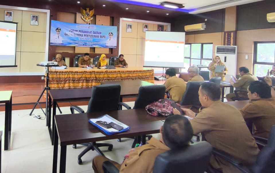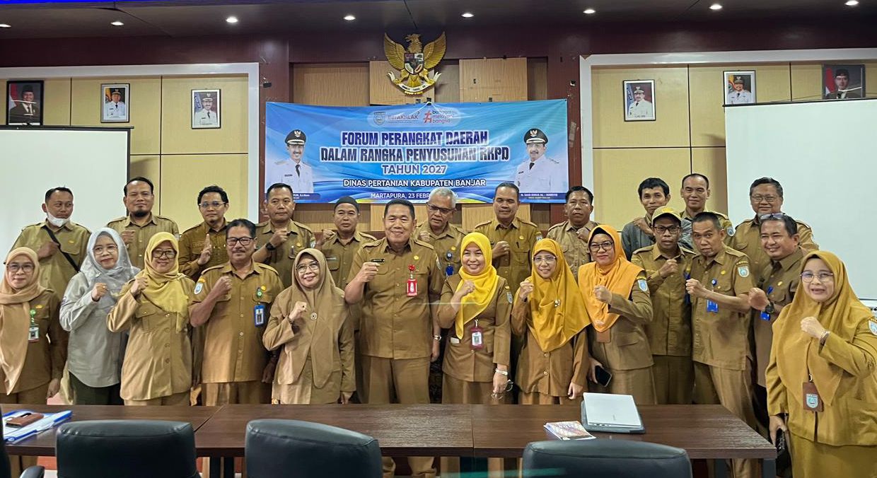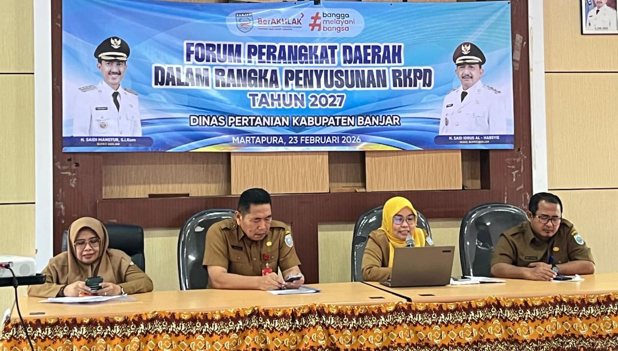 MARTAPURA - Sebagai bagian dari tahapan strategis dalam mematangkan dan menajamkan Rencana Kerja Pemerintah Daerah (RKPD) Tahun 2027, Bappedalitbang Kabupaten Banjar turut ambil bagian dalam Forum Perangkat Daerah yang digelar oleh Dinas Pertanian Kabupaten Banjar, Senin (23/2), di Aula Rapat Dinas Pertanian Kabupaten Banjar. Kehadiran Bappedalitbang menjadi bentuk komitmen dalam mengawal sinkronisasi program dan kegiatan sektor pertanian agar selaras dengan arah pembangunan daerah tahun 2027.