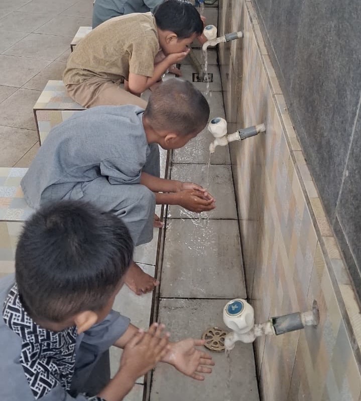 Tidak hanya teori, pembelajaran juga dikemas dalam bentuk praktik langsung. Anak-anak melakukan praktik berwudhu dengan bimbingan guru, mulai dari membasuh tangan hingga kaki sesuai urutan yang benar. Setelah itu, kegiatan dilanjutkan dengan praktik shalat berjamaah, sehingga peserta didik dapat memahami tata cara ibadah secara utuh, baik dari sisi persiapan maupun pelaksanaannya.