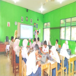 Pelaksanaan gladi bersih berlangsung di ruang kelas dengan suasana yang kondusif. Para siswa yang mengenakan seragam putih biru tampak tenang saat mengakses sistem ujian digital. Dinding kelas yang didominasi warna hijau cerah menciptakan suasana belajar yang segar, sementara fasilitas teknologi yang memadai seperti Smart Board dimanfaatkan untuk menampilkan password login serta petunjuk teknis bagi peserta ujian.
