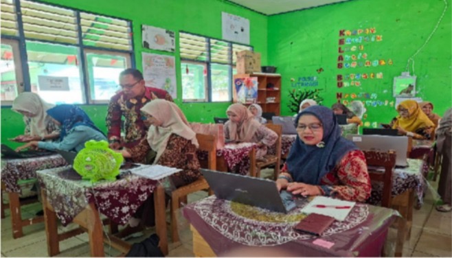 Suasana pelatihan berlangsung interaktif. Peserta fokus mempraktikkan pembuatan portofolio digital di laptop masing-masing, dibimbing langsung jika mengalami kendala teknis, sehingga semua guru dapat memahami alur digitalisasi dokumen dengan baik.