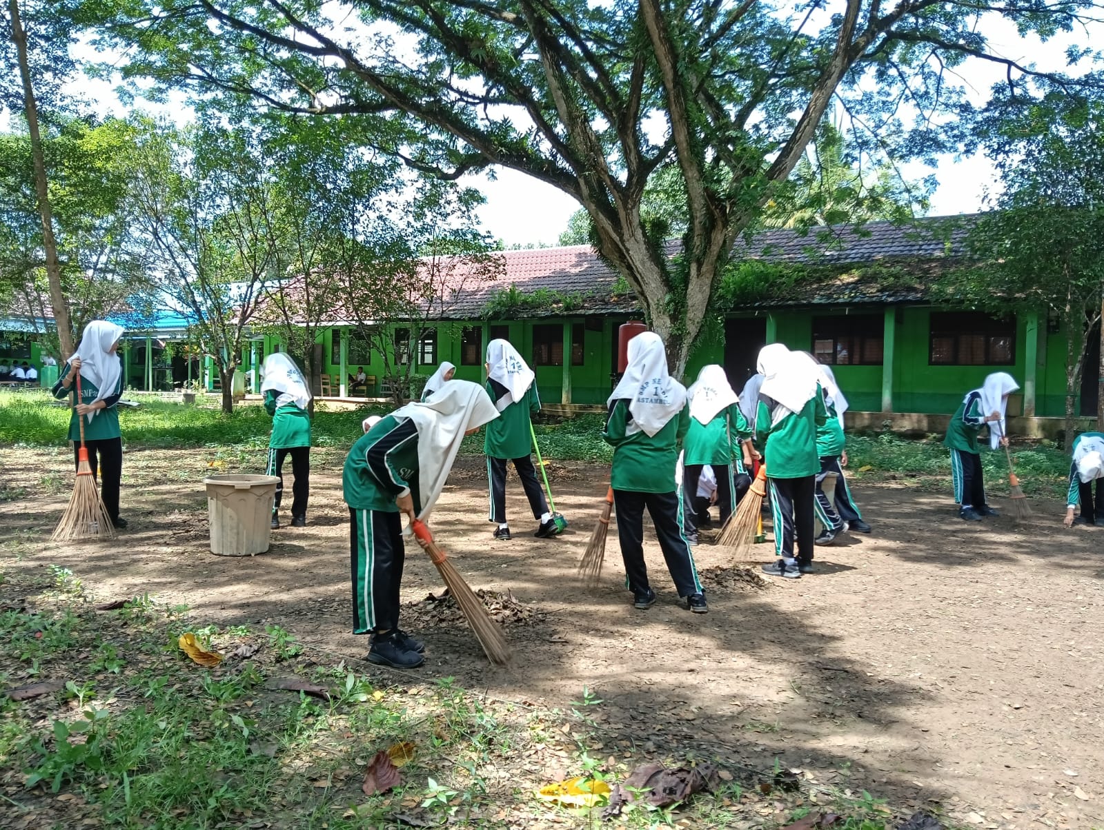 Di bawah arahan guru PJOK, Hamni Abdullah, S.Pd, siswa tidak hanya melakukan peregangan seperti biasa, tetapi juga diarahkan untuk bergerak aktif dengan mengambil sapu dan berlari menuju lapangan bola voli. Selanjutnya, mereka melakukan kegiatan menyapu dan mengumpulkan sampah daun dalam waktu yang telah ditentukan.