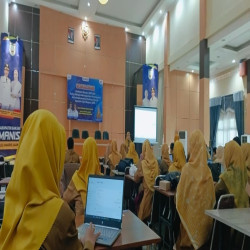 Dalam pelaksanaan sosialisasi, suasana aula tampak tertib dan produktif. Para peserta, termasuk Nurlatifah selaku Pengawas TK, terlihat fokus menyimak penjelasan narasumber sembari langsung mempraktikkan pengisian data kinerja melalui laptop masing-masing.