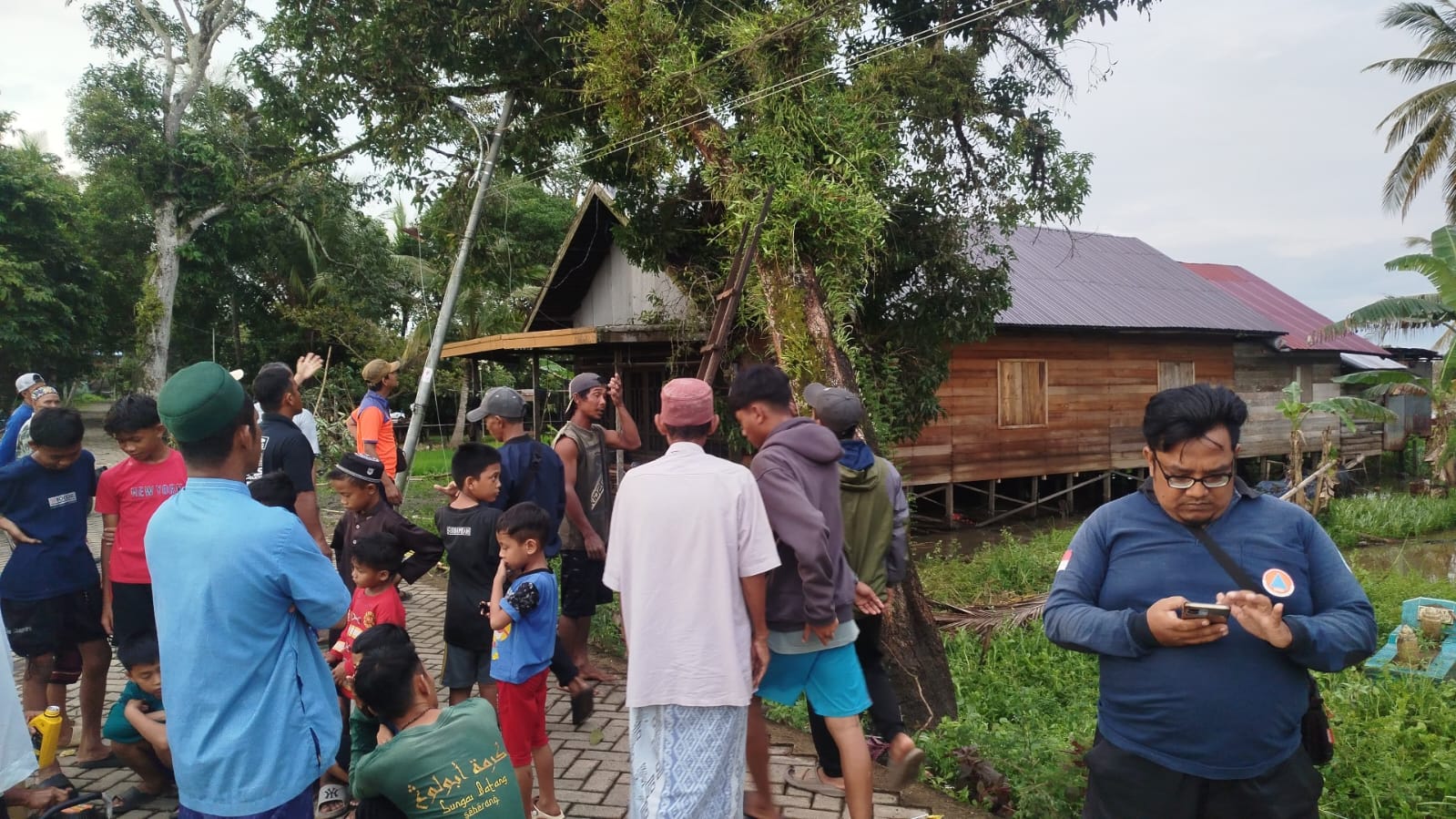 Sementara itu, pada satu titik pohon tumbang yang berada di dekat rumah warga, penanganan dilakukan oleh BPBD Kabupaten Banjar bersama masyarakat dengan melakukan pemotongan pohon serta pendataan dampak kejadian.