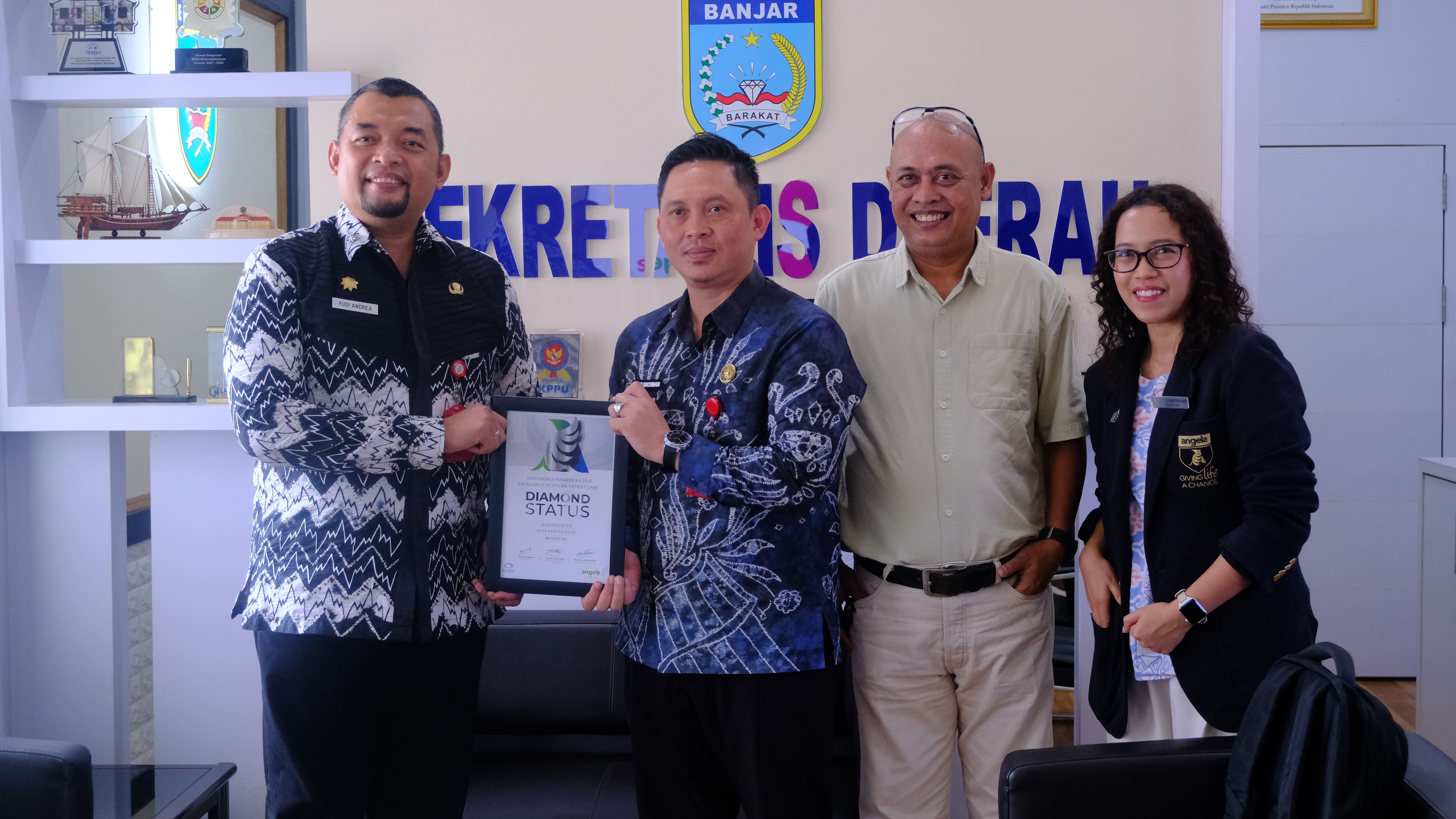 MARTAPURA, InfoPublik — Komitmen peningkatan layanan stroke di daerah kembali membuahkan hasil membanggakan. RSUD Ratu Zalecha resmi menerima Sertifikat Angels Award dari World Stroke Organization (WSO) dalam kegiatan audiensi sekaligus penyerahan penghargaan yang berlangsung di ruang kerja Sekretaris Daerah Kabupaten Banjar, Kamis (16/4/2026).