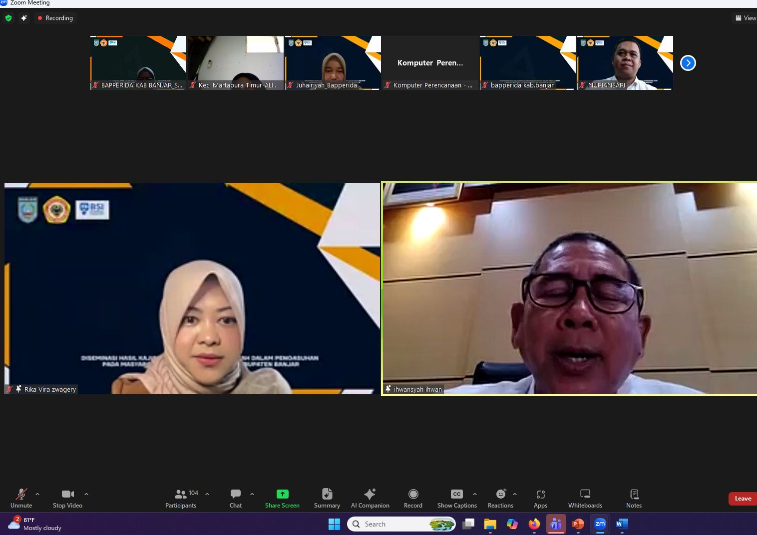 MARTAPURA, InfoPublik - Bapperida Kabupaten Banjar kembali menunjukkan komitmennya dalam mendorong inovasi pembangunan melalui program BSI (Bapperida Sapa Inovator). Kali ini, BAPPERIDA menggelar webinar diseminasi hasil kajian bertajuk “Model Keterlibatan Ayah dalam Pengasuhan pada Masyarakat Pinggiran Sungai di Kabupaten Banjar”. Kegiatan ini dilaksanakan secara daring melalui Zoom Meeting pada Rabu, (22/4/2026) pagi.